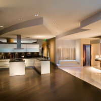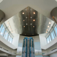 The 21-foot central atrium, crowned by a cantilever concrete slab, anchors the center circulation towards the North and South wings of the structure.