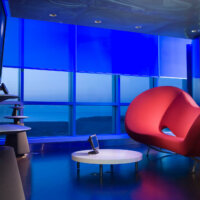 To establish a balance between the sculptural structure and the ocean environment, the building interior was conceived as a transition between both, being finished with environmental non-processed surfaces, incorporating natural, essential materials and multi- organic furniture. (Metaphoric gesture representing ocean flora & fauna).